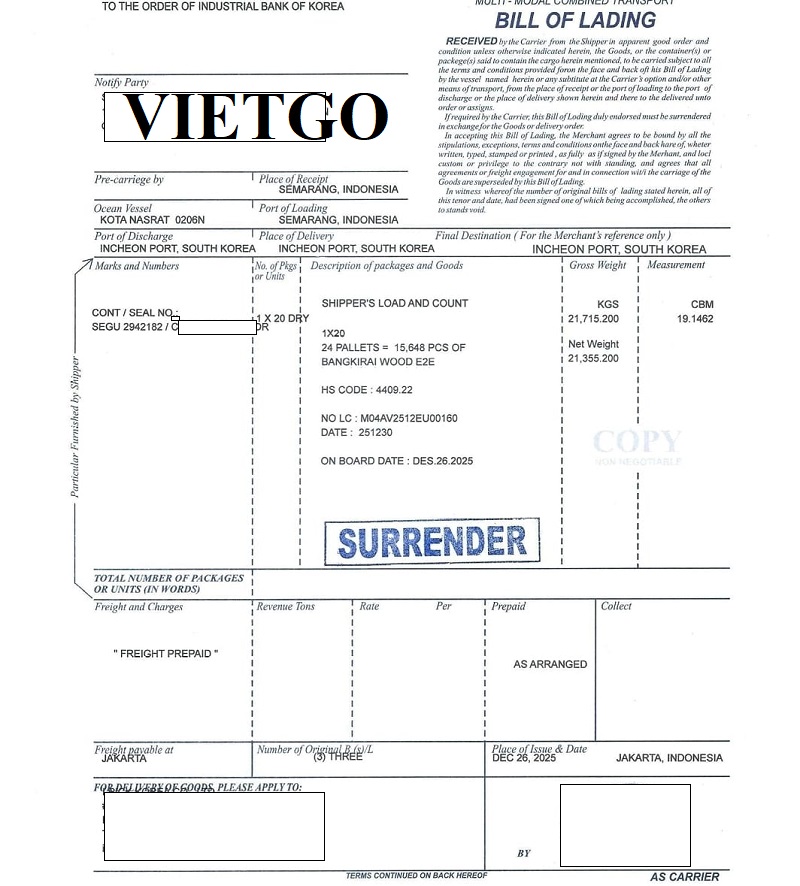 Phụ trách mảng thu mua và phát triển nguồn cung của ██████████là anh Rodrigo – người đã gắn bó nhiều năm với công ty và có kinh nghiệm sâu rộng trong việc tìm kiếm, đánh giá và xây dựng mạng lưới nhà cung cấp. Song song với sản xuất, công ty đặc biệt coi trọng việc thiết lập các mối quan hệ hợp tác bền vững, minh bạch và lâu dài với đối tác trong và ngoài nước. Công ty cũng đã có kinh nghiệm trong lĩnh vực gỗ, thông qua việc nhập khẩu các sản phẩm gỗ xẻ từ Indonesia. Dưới đây là hình ảnh bản vận đơn nhập khẩu gỗ xẻ từ Indonesia tới Hàn Quốc công ty anh đã thực hiện vào ngày 26/12/2025 vừa qua.