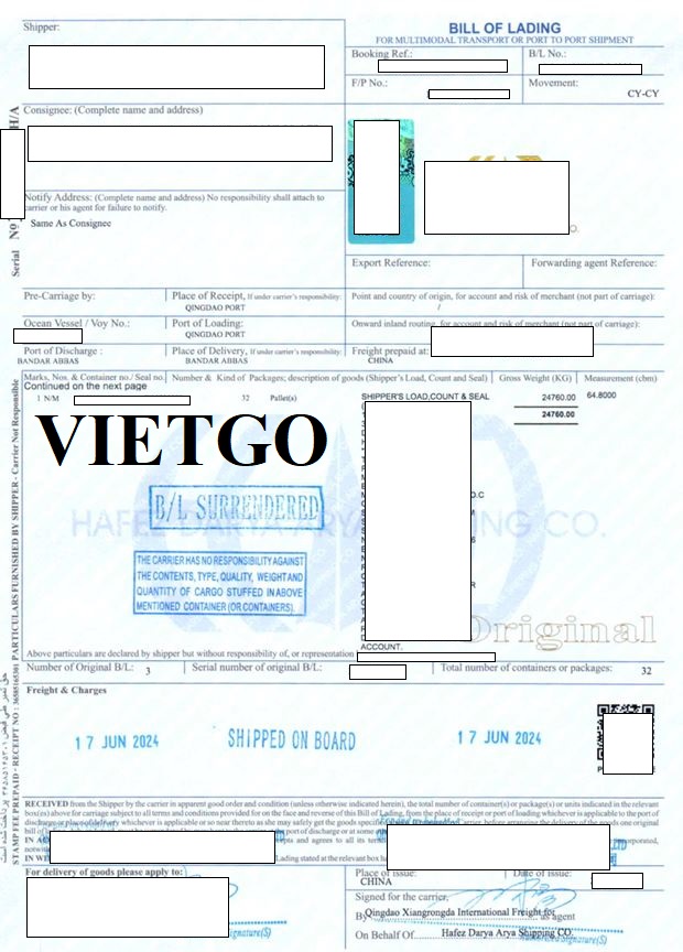 Hình ảnh bản vận đơn của chuyến hàng vị khách hàng nhập khẩu thành công 64.8m3 sản phẩm Đất tảo cát từ cảng Thanh Đảo đến cảng Bandar Abbas, Iran