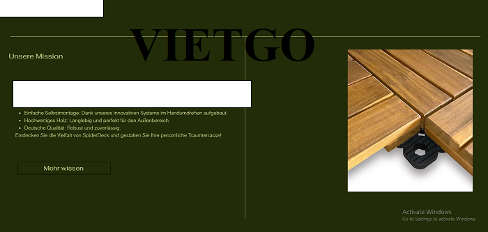 ██████████ là một thương hiệu chuyên về decking tiles – vỉ lát sàn ngoài trời dành cho sân vườn, ban công và các khu vực tiếp xúc trực tiếp với thời tiết. Sản phẩm của ██████████ được thiết kế để lắp ghép dễ dàng, tăng thẩm mỹ và độ bền cho bề mặt sàn từ gỗ tự nhiên, hướng đến người dùng tại thị trường châu Âu, đặc biệt là Đức và các nước lân cận với xu hướng sử dụng vật liệu ngoại thất thân thiện môi trường.