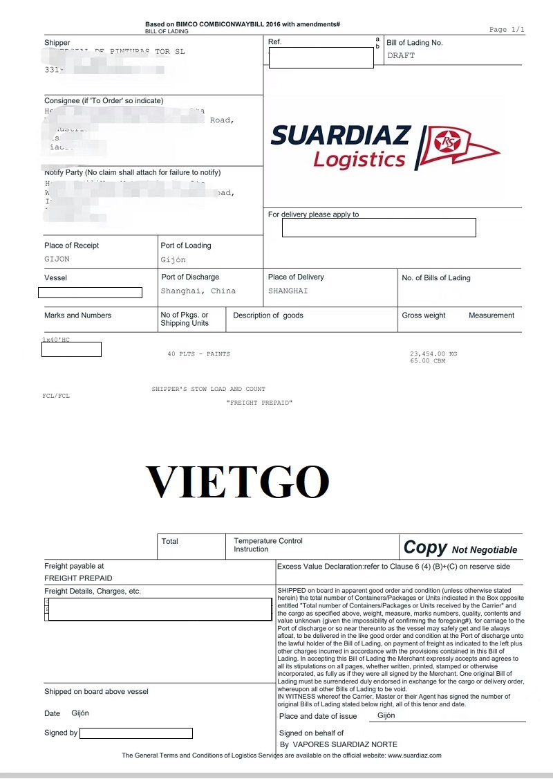 Hình ảnh bản vận đơn vị khách hàng nhập khẩu thành công sản phẩm sơn được sản xuất tại Tây Ban Nha, vận chuyển từ cảng Gijón, Bắc Tây Ban Nha đến cảng Thượng Hải, Trung Quốc