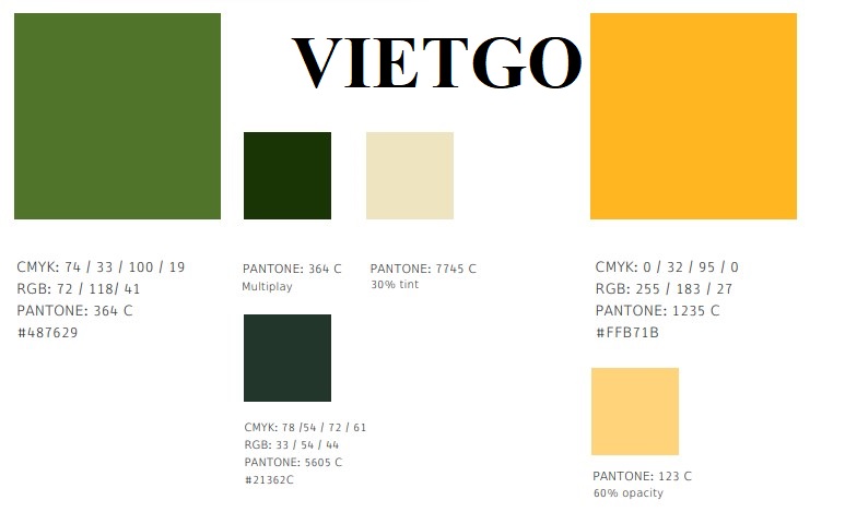); chữ màu trắng ngà (PANTONE: 7745 C); logo màu vàng (PANTONE: 1235 C