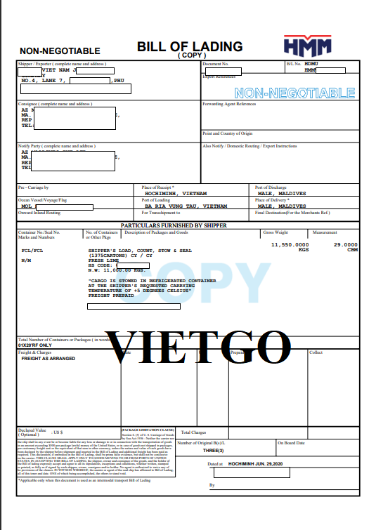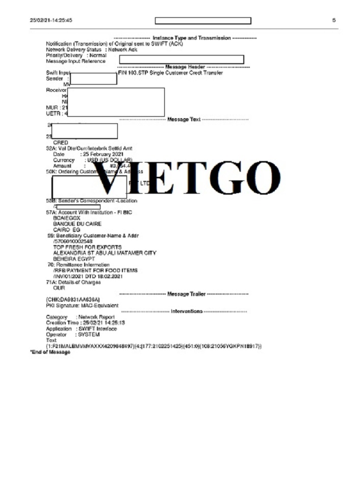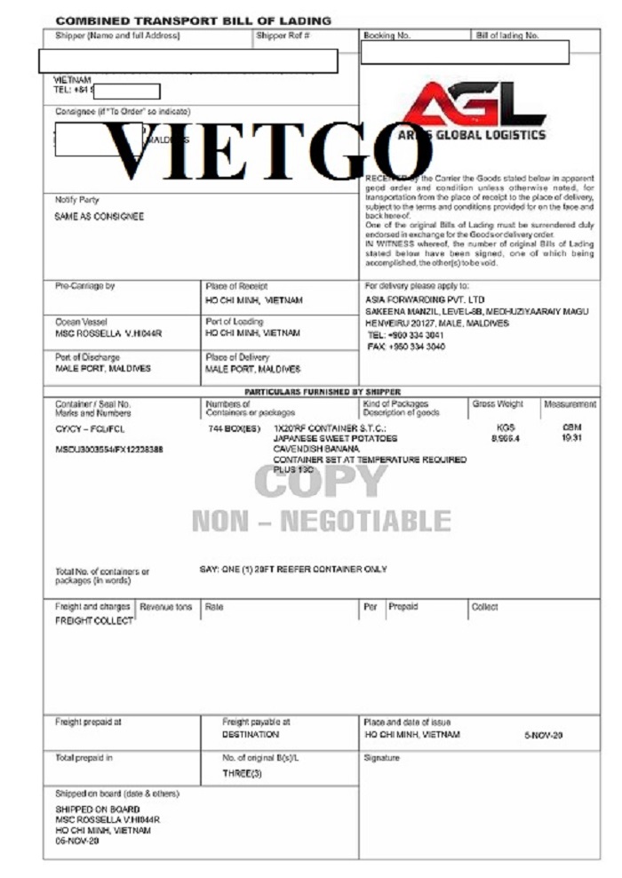 Dưới đây là bản sao thanh toán cho giao dịch nhập khẩu và bản vận đơn nhập khẩu khoai lang từ Việt Nam mà vị khách hàng đã thực hiện trong thời gian vừa qua: