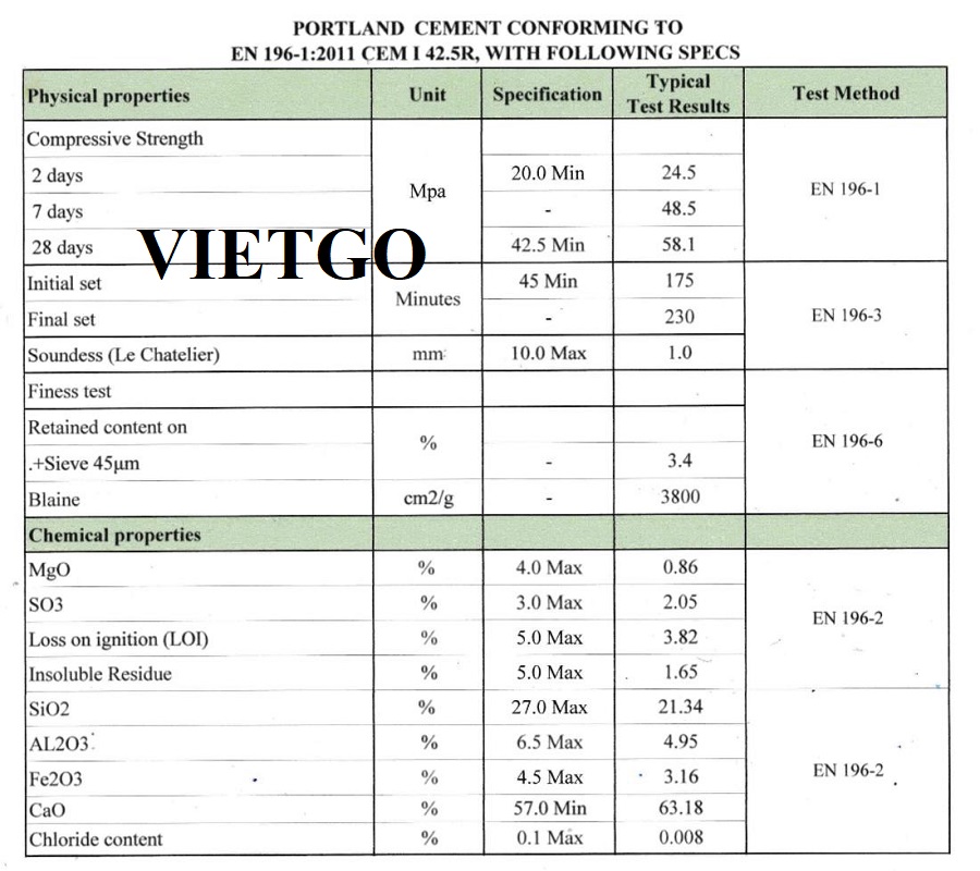 Hình ảnh thông số kỹ thuật tham khảo xi măng mác 42.5R