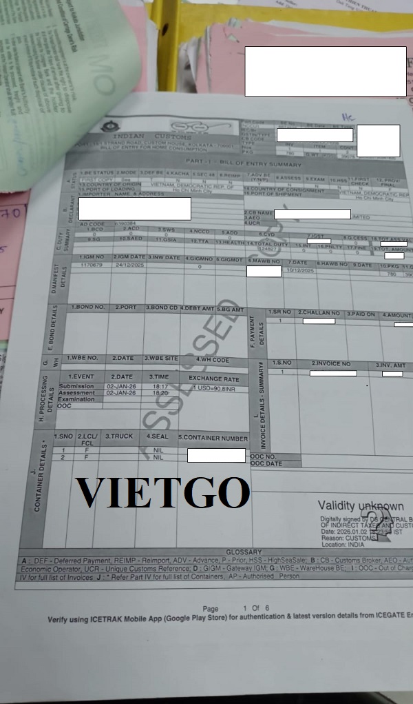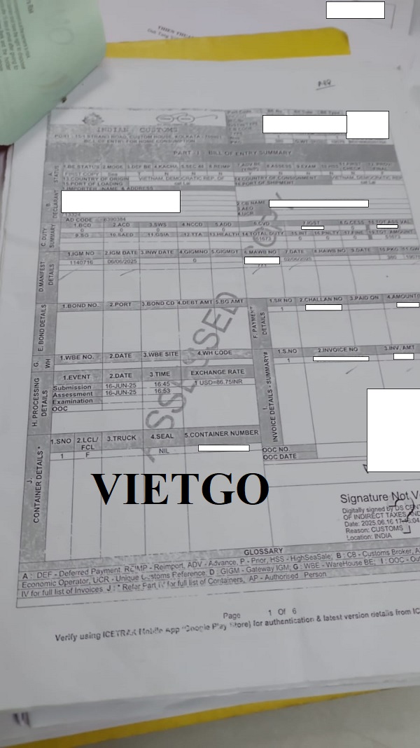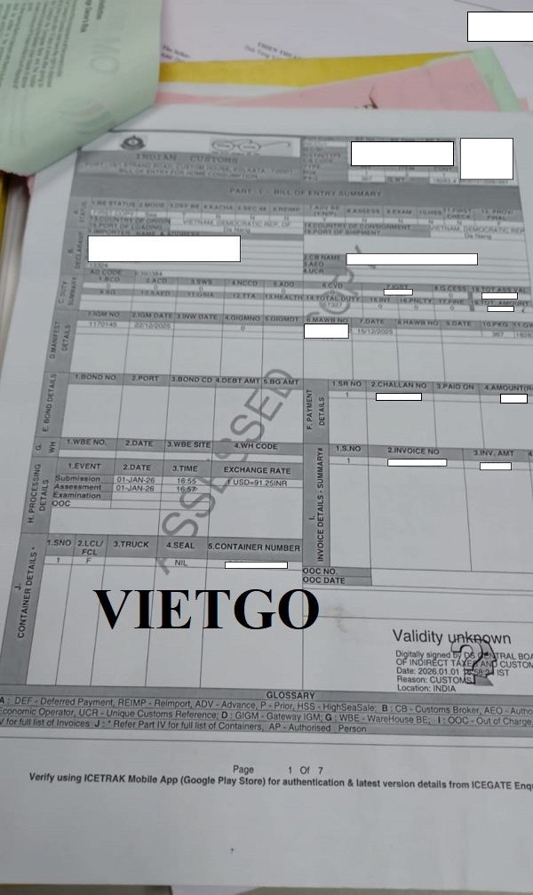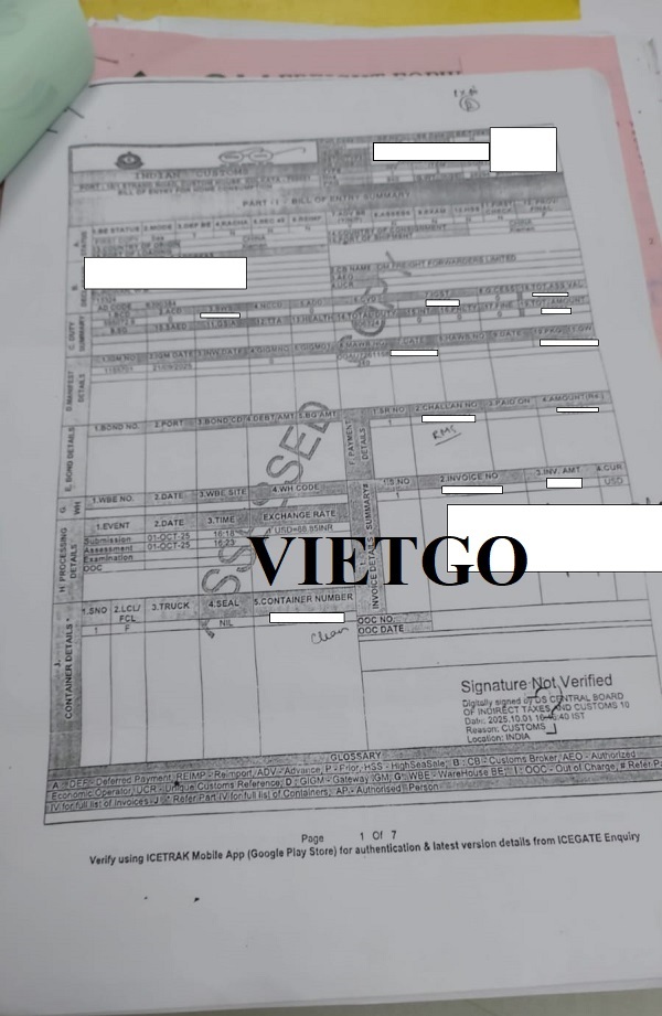 Hình ảnh một số giấy tờ nhập hẩu hàng hóa từ Việt Nam của công ty vị khách hàng