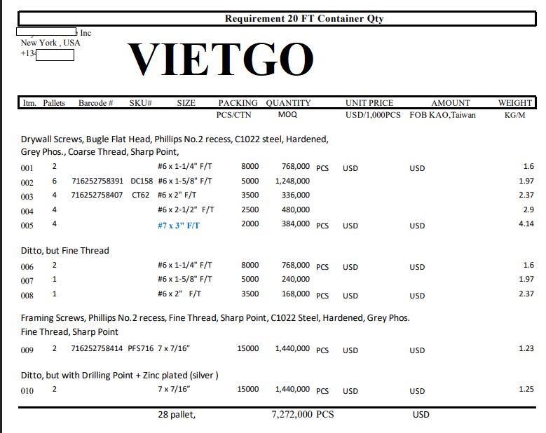 VIETGO xin gửi tới Quý nhà cung cấp thông tin đơn hàng, VIETGO chúc Quý vị có được một thương vụ thành công!