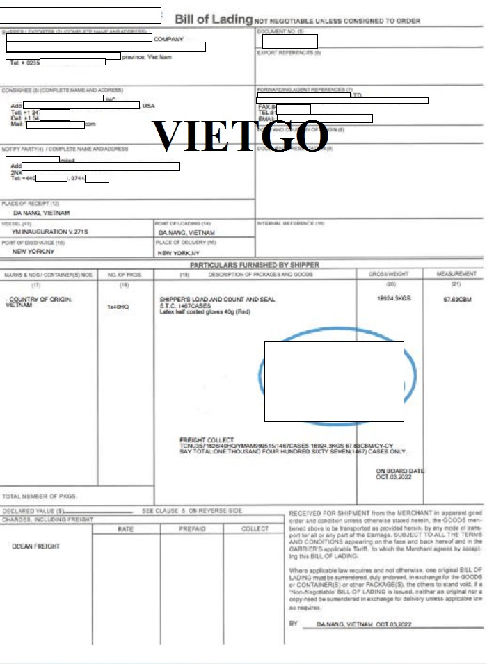 Dưới đây là hình ảnh một vận đơn đường biển (Bill of Lading) của một chuyến hàng nhập khẩu thành công găng tay từ Việt Nam của công ty vị khách hàng vào năm 2022.