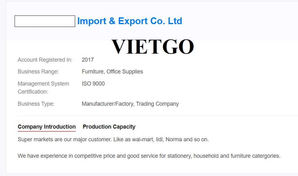 Vừa qua, Vietgo đã có cuộc trò chuyện ngắn với cô Saul – thuộc công ty ██████████đang có dự án xuất khẩu tới thị trường Đức nên cần nhập khẩu bàn ghế để phục vụ cho hoạt động kinh doanh của mình.