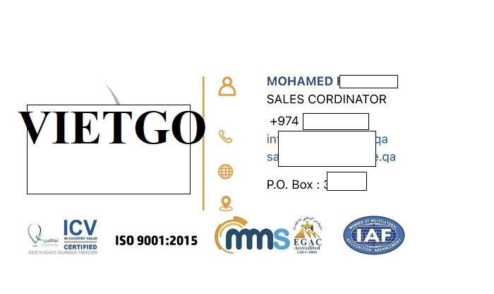 Vừa qua, ông Mohamed ██████████ đã có cuộc thảo luận với VIETGO và bày tỏ mong muốn được nhập khẩu gỗ vụn tới thị trường Qatar. Ông là quản lý trực tiếp của công ty ██████████ - công ty của ông Mohamed hoạt động trong lĩnh vực tìm kiếm nguồn cung cấp hàng hóa theo yêu cầu của khách hàng.