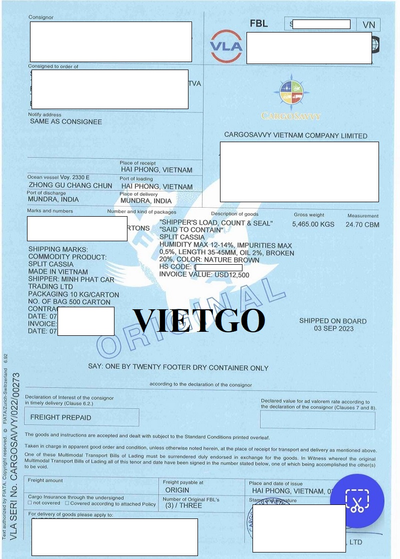 Hình ảnh bản vận đơn nhập khẩu quế chẻ từ Việt Nam của công ty vị khách vào ngày 3/9/2023