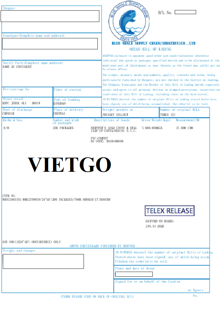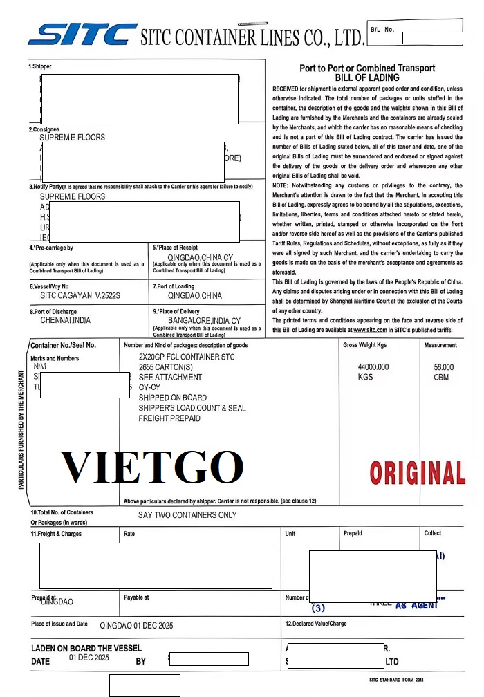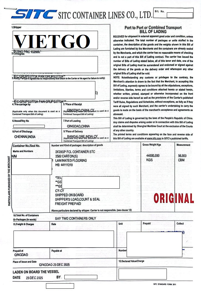 Dưới đây là hình ảnh các bản vận đơn vị khách hàng sẽ nhập khẩu sản phẩm ván sàn và ván laminate từ cảng Qingdao, Trung Quốc đến cảng Chennai và cảng Ennore, Ấn Độ.