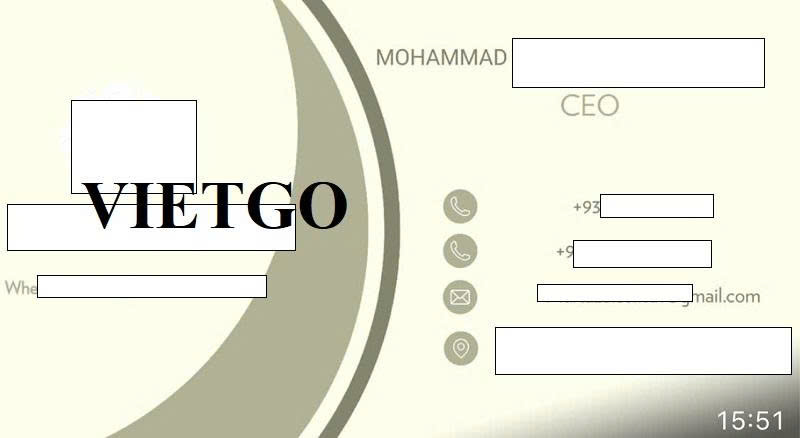 Quý nhà cung cấp nếu có thể đáp ứng các yêu cầu từ ông Mohammad xin vui lòng liên hệ và gửi sản phẩm mẫu cũng như báo giá trong thời gian sớm nhất qua địa chỉ liên hệ mà chúng tôi cung cấp sau đây: