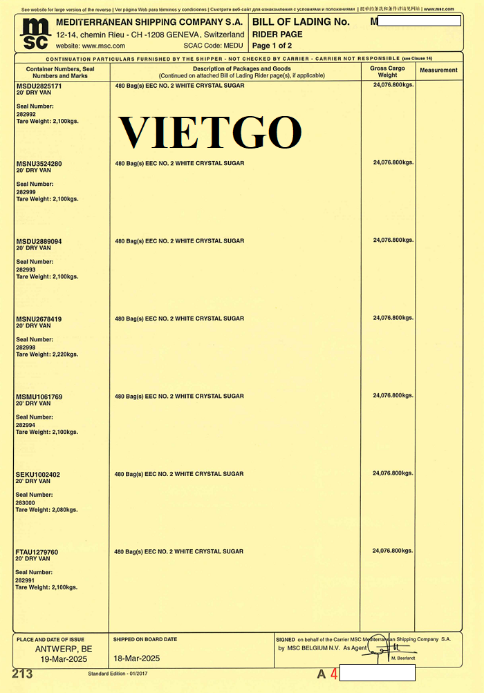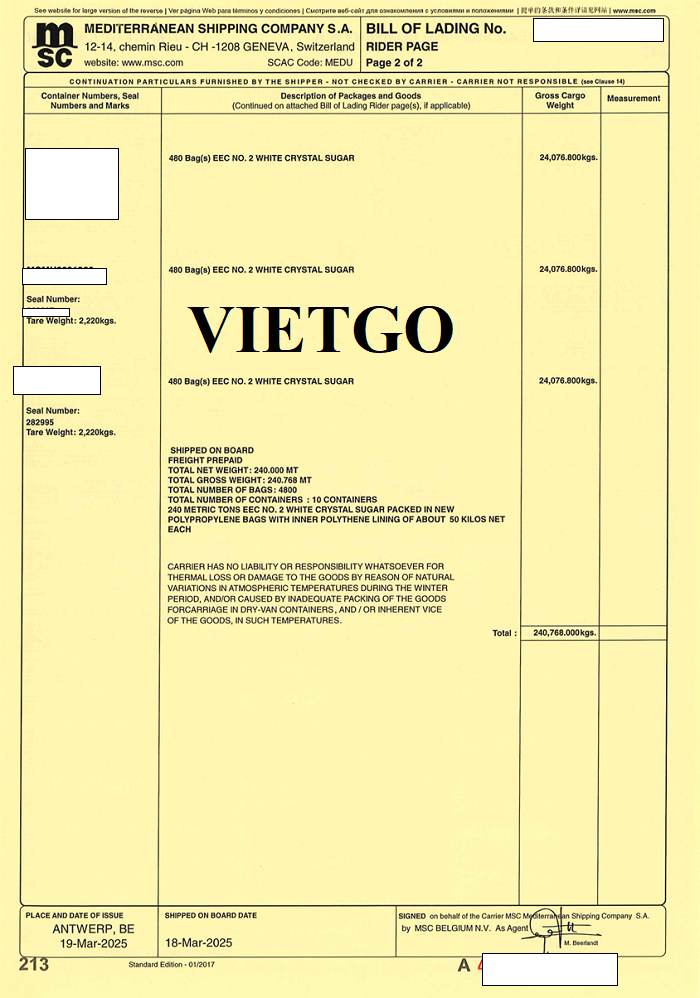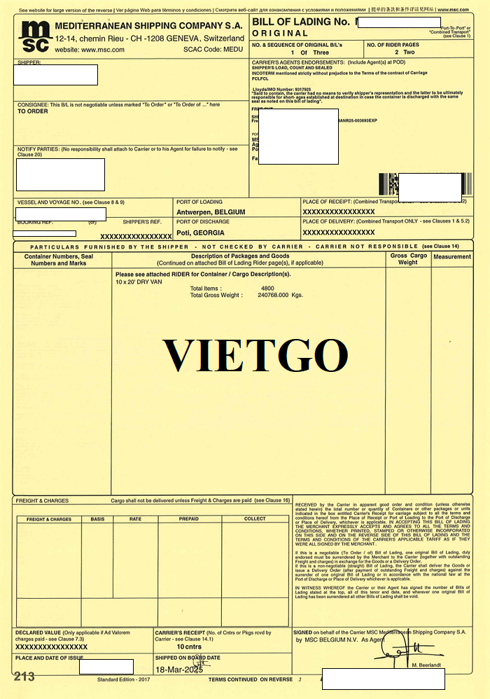 Vị khách hàng đã cung cấp vận đơn thể hiện giao dịch nhập khẩu mười container đường từ Bỉ về Georgia vào ngày 19 tháng 3 năm 2025. Thông tin này cho thấy doanh nghiệp đã có kinh nghiệm thực tế trong việc tổ chức các lô hàng đường với quy mô tương đối lớn từ thị trường châu Âu. Ngoài ra, thông qua những giao dịch như vậy, ██████████ cũng thể hiện khả năng làm việc với các đối tác quốc tế, xử lý các thủ tục thương mại và vận chuyển hàng hóa xuyên biên giới một cách bài bản.