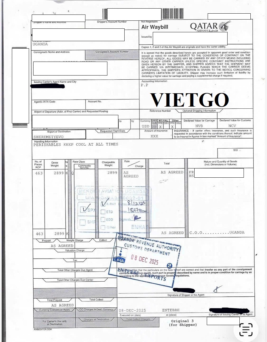 Dưới đây là hình ảnh bản vận đơn nhập khẩu trái cây và rau củ từ Uganda mà vị khách hàng đã thực hiện vào ngày 08/12/2025: