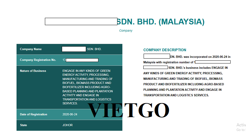 Công ty ████████████████████là doanh nghiệp có trụ sở tại bang Johor, Malaysia, được thành lập vào năm 2020. Công ty hoạt động trong lĩnh vực năng lượng tái tạo, tập trung vào các hoạt động liên quan đến sinh khối như sản xuất, chế biến và kinh doanh nhiên liệu sinh học, đồng thời tham gia vào các hoạt động nông nghiệp và logistics liên quan.