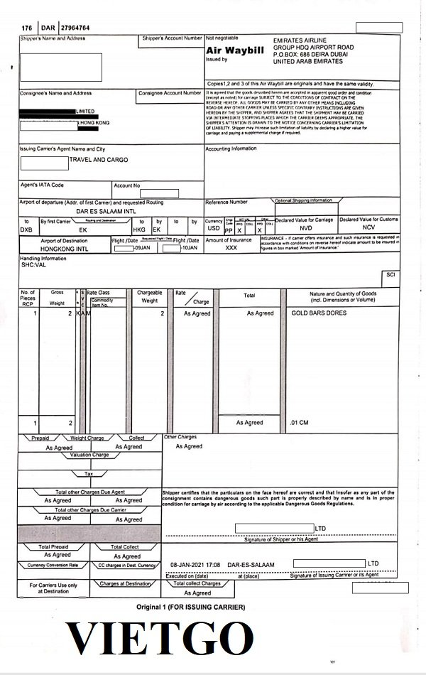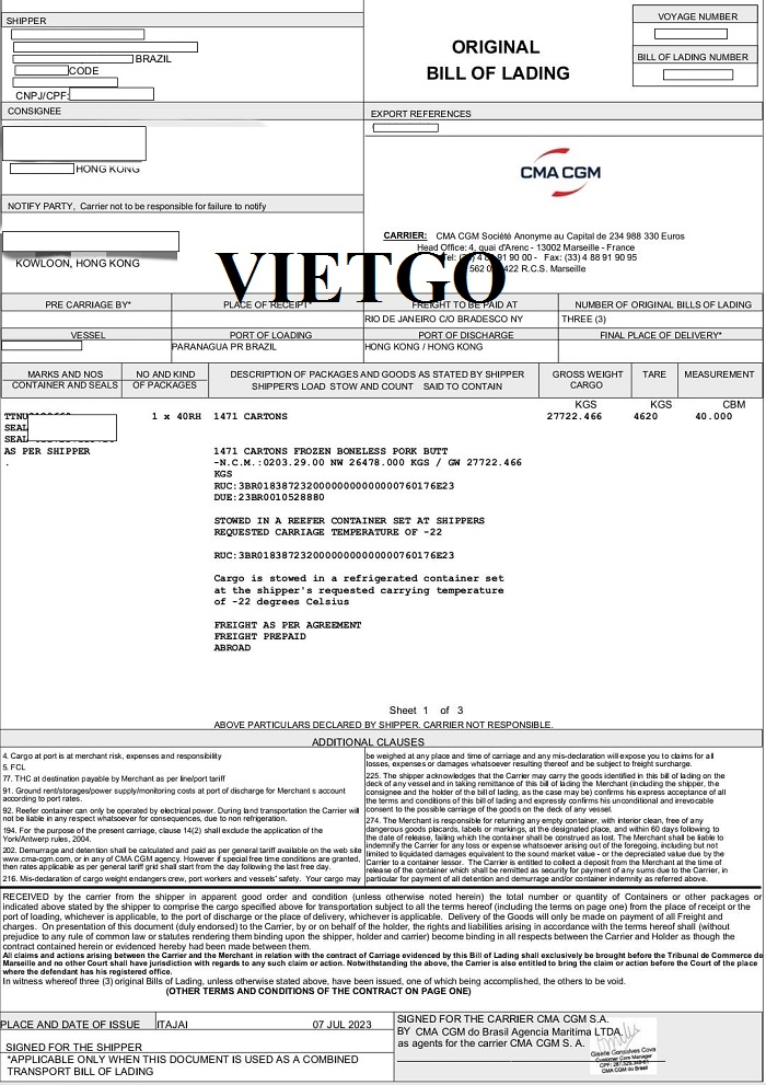 Dưới đây là hình ảnh bản vận đơn nhập khẩu thành công sản phẩm thịt lợn từ Brazil vào ngày 7/7/2023 và vận đơn nhập khẩu thành công sản phẩm vàng từ Tanzania sang Hồng Kông ngày 08/01/2021 mà công ty vị khách hàng đã thực hiện thành công: