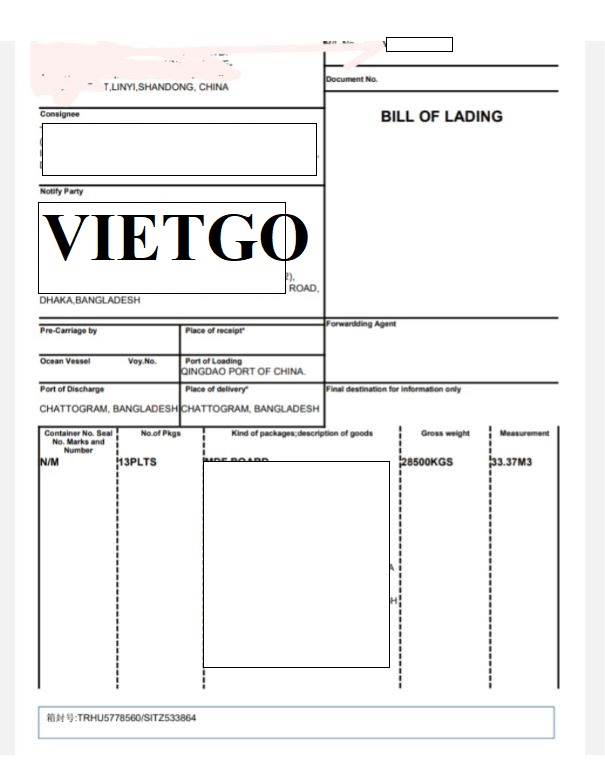 Hình ảnh bản vận đơn nhập khẩu ván MDF từ Trung Quốc tới Bangladesh của công ty vị khách hàng