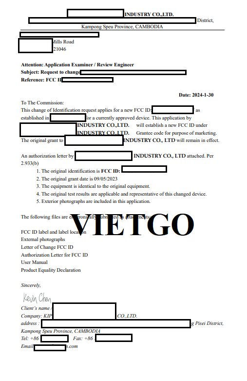 Công ty ████████████████████INDUSTRY CO., LTD. là một doanh nghiệp sản xuất có trụ sở tại Campuchia, Kampong Speu. Công ty hoạt động trong lĩnh vực sản xuất và gia công công nghiệp, với định hướng phát triển các sản phẩm đạt tiêu chuẩn quốc tế, đặc biệt là thị trường Hoa Kỳ. Công ty được biết đến qua việc tham gia các thủ tục chứng nhận và đăng ký sản phẩm với Ủy ban Truyền thông Liên bang Hoa Kỳ (FCC). Bên cạnh đó, ████████████████████còn có mối liên kết với ████████████████████(CAMBODIA) INDUSTRY CO., LTD., thể hiện qua việc được ủy quyền sử dụng và phát triển các sản phẩm đã được cấp chứng nhận trước đó. Sự hợp tác này giúp doanh nghiệp tận dụng nền tảng công nghệ sẵn có, đồng thời nâng cao năng lực sản xuất và khả năng cạnh tranh trên thị trường quốc tế.