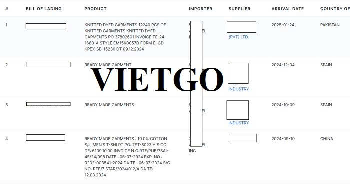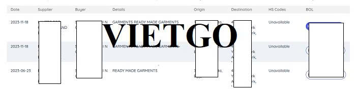Hình ảnh thông tin một số chuyến hàng nhập khẩu hàng dệt may sang Mỹ của công ty vào năm 2023, 2024 và 2025