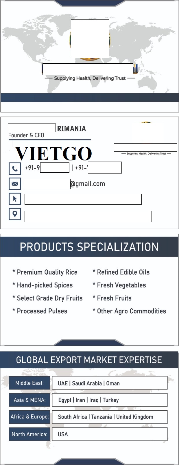 Ông Rimania hiện đang điều hành công ty ██████████ là một doanh nghiệp nổi tiếng trong ngành xuất nhập khẩu nông sản. Côny ty chuyên làm việc về các sản phẩm như trái cây, hạt, gia vị và có nhiều đối tác chiến lược trên khắp thế giới. Với vai trò trực tiếp tham gia vào các hoạt động thương mại quốc tế, ông Rimania thể hiện rõ kinh nghiệm trong việc kết nối nguồn hàng, đánh giá nhà cung cấp và tổ chức chuỗi cung ứng phục vụ thị trường. Việc ông quan tâm đến mặt hàng hạt điều nhân ██████████ để nhập khẩu cho thấy định hướng tập trung vào phân khúc thực phẩm có giá trị cao, yêu cầu nghiêm ngặt về chất lượng.
