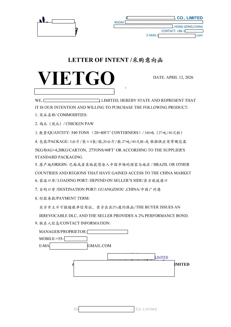 Hiện tại, khách hàng đang có nhu cầu nhập khẩu khoảng 540 tấn chân gà, tương đương 20 container 40 feet, với điều kiện thanh toán bằng thư tín dụng không hủy ngang. Đại diện công ty cũng cho biết trong giai đoạn cao điểm, doanh nghiệp từng xử lý khối lượng lên tới 50 container mỗi tháng, cho thấy quy mô giao dịch tương đối lớn. Hiện tại, do nhập khẩu trực tiếp vào Trung Quốc đại lục, khách hàng yêu cầu các nhà máy sản xuất phải được đăng ký với cơ quan hải quan Trung Quốc. Đáng chú ý, phía người mua còn đề xuất điều khoản yêu cầu bên bán cung cấp khoản bảo lãnh thực hiện hợp đồng tương đương 2% giá trị đơn hàng, thể hiện kỳ vọng cao về năng lực thực hiện nhưng đồng thời cũng đặt ra yêu cầu cần được xem xét và đánh giá thận trọng trước khi tiến hành hợp tác.