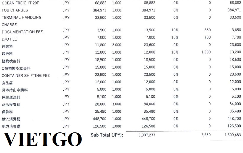 Hình ảnh bảng chi phí nhập khẩu