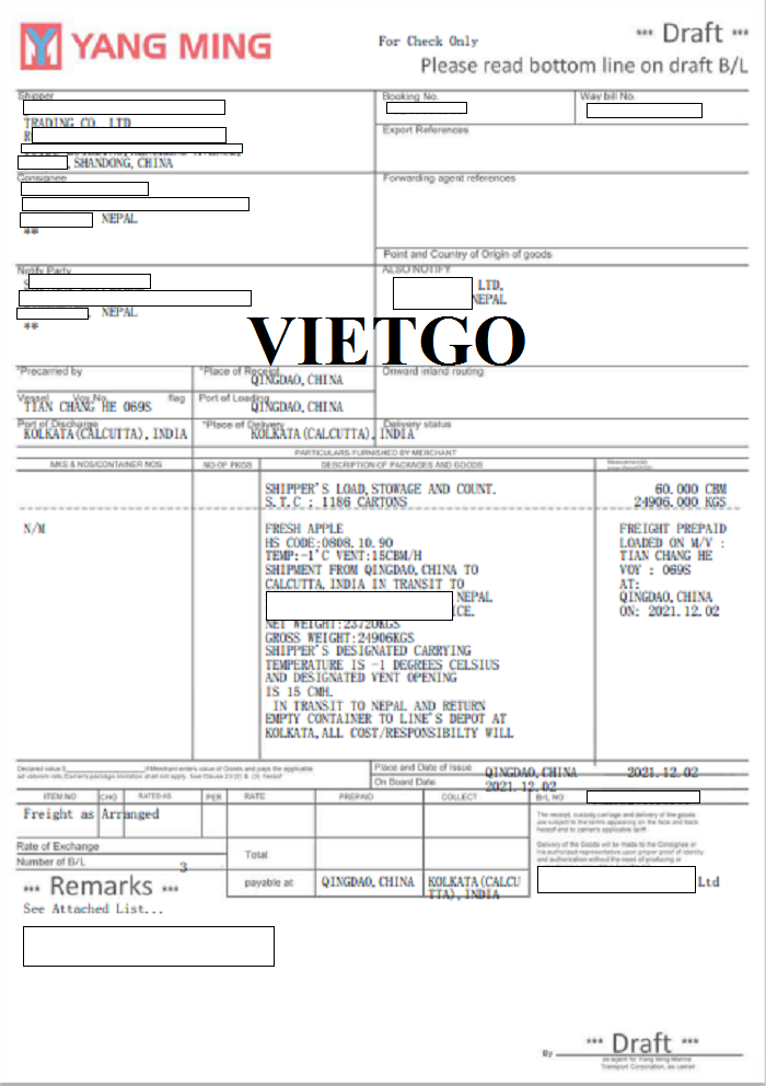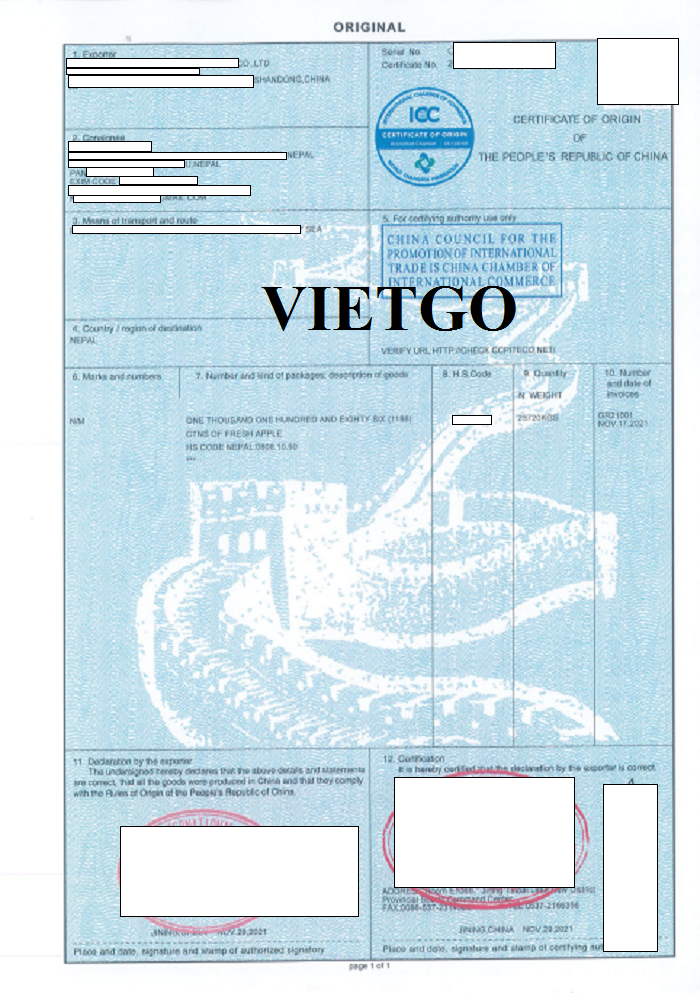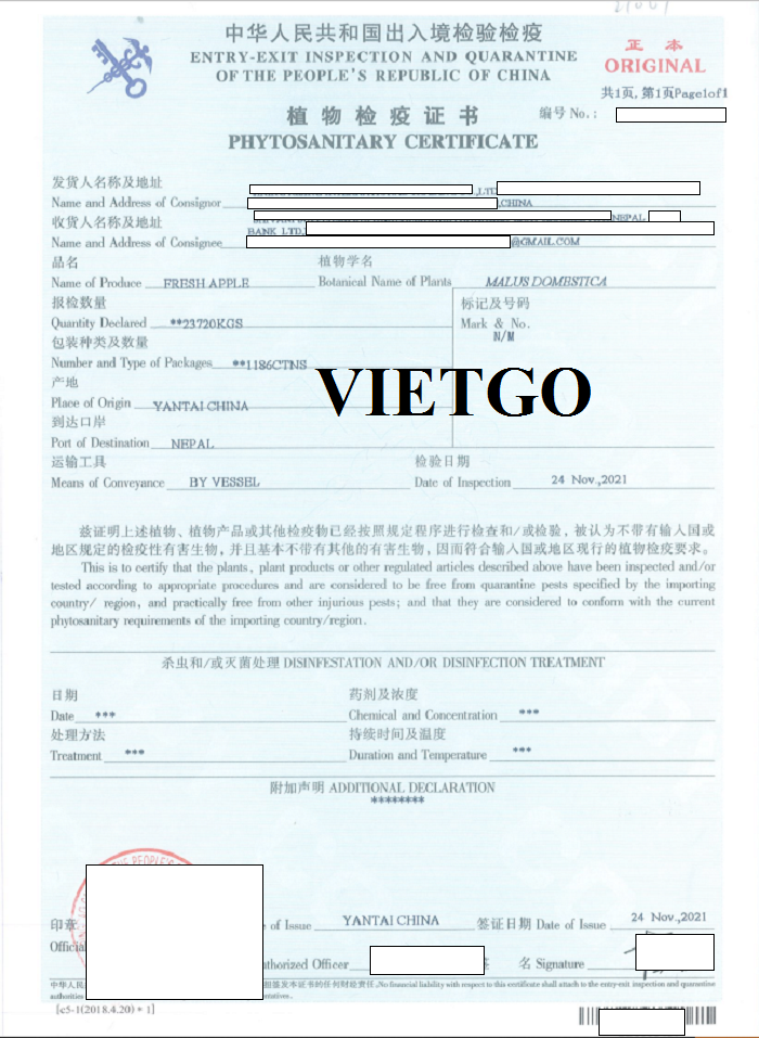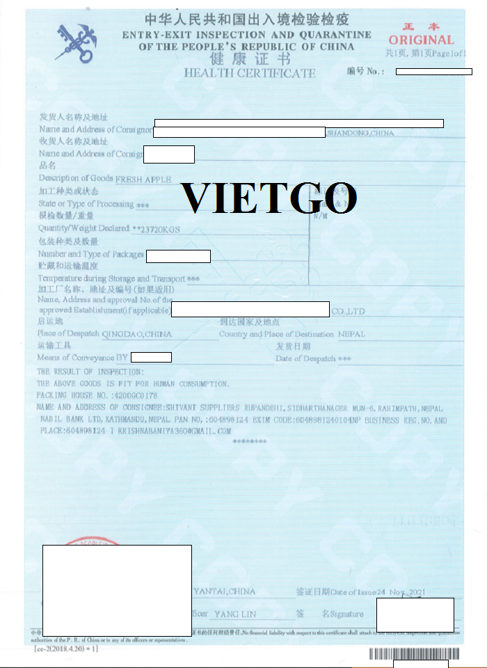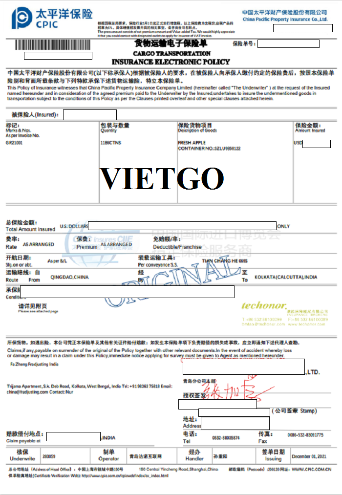 Dưới đây là một số giấy tờ nằm trong đơn hàng nhập khẩu táo tươi vào ngày 02 tháng 12 năm 2021 do công ty vị khách hàng từng thực hiện thành công, bao gồm vận đơn đường biển, giấy kiểm dịch thực vật, chứng nhận y tế, chứng giận xuất xứ hàng hóa và bảo hiểm vận chuyển: