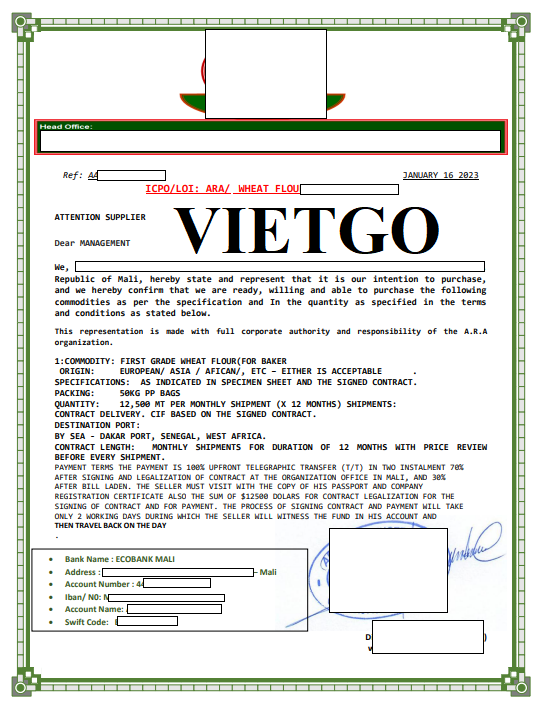 VIETGO xin gửi tới Quý nhà cung cấp thông tin đơn hàng nhập khẩu hàng tháng bột mì sang thị trường Senegal của cô Aminata.