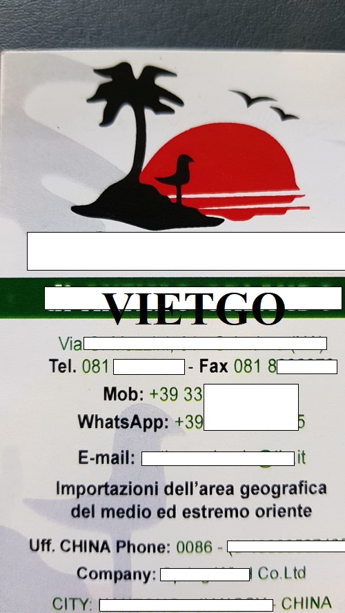 Trò chuyện với VIETGO, vị khách hàng chia sẻ: “Xin chào! Tên của tôi là Antimo ██████████. Tôi là Tổng Giám đốc tiếp thị của Tập đoàn Công nghiệp chế biến thực phẩm lớn tại nước Ý có tên là ██████████. Hiện chúng tôi quan tâm đến một số sản phẩm nông sản như tỏi, gừng, hành, để phục vụ cho dự án kinh doanh sắp tới của công ty. Tôi hoạt động trong lĩnh vực này đến nay đã được hơn 47 năm, trong đó có tới 39 năm chúng tôi nhập khẩu nguyên liệu thô từ Trung Quốc. Như bạn có thể thấy từ danh thiếp của tôi, tôi làm việc với một chuyên gia người Trung Quốc và chúng tôi có văn phòng tại thành phố Nam Thông với tên gọi ██████████ Ltd.