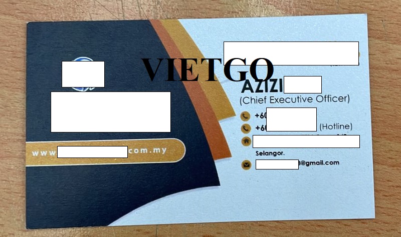 VIETGO vừa có cuộc trao đổi với ông Azizi về đơn hàng nhập khẩu mũ để phục vụ cho công việc kinh doanh tại thị trường Malaysia. Được biết, ông Azizi hiện đang công tác tại ██████████ SDN. BHD. Công ty được thành lập vào ngày 06 tháng 02 năm 2017, có địa chỉ tại số ██████████ 1██████████ ██████████, ██████████, Malaysia. Được biết, công ty đã có nhiều năm kinh nghiệm trong lĩnh vực xuất nhập khẩu hàng hóa, cũng như cung cấp dịch vụ tìm kiếm nguồn cung ứng sản phẩm theo yêu cầu của khách hàng.