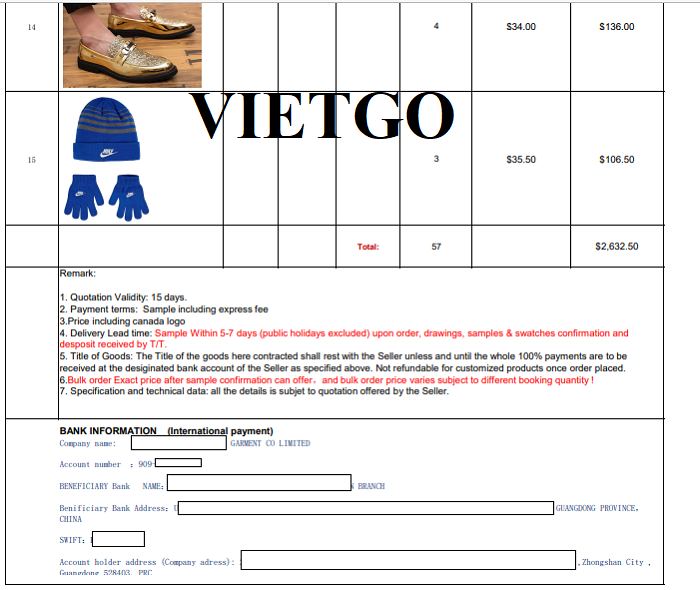 VIETGO xin gửi tới Quý nhà cung cấp đơn hàng xuất khẩu quần áo thể thao cho một vị khách hàng đến từ Brunei, ông Ryan.