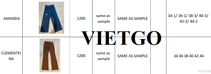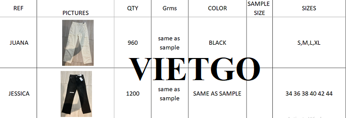 VIETGO xin gửi tới Quý nhà cung cấp đơn hàng quần jean cho một vị khách hàng đến từ một quốc gia Nam Mỹ, cô Agustina.