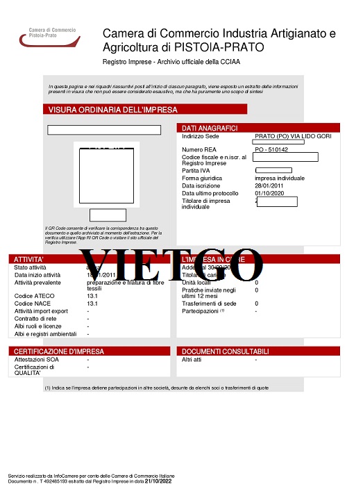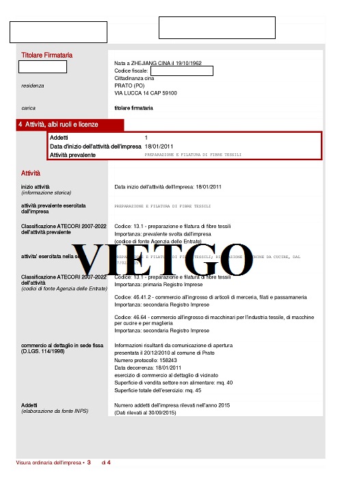 Chia sẻ với chúng tôi, ông Xu cho biết ông là người Trung Quốc hiện đang sinh sống và làm việc tại Ý. Công ty của ông Xu có tên là ██████████ – công ty có trụ sở chính đặt tại thành phố Prato, vùng Tuscany. Công ty được đăng ký kinh doanh vào ngày 28/1/2011, giám đốc của công ty là ông ██████████ người Trung Quốc. Hiện công ty đang hoạt động chính trong lĩnh vực phân phối các sản phẩm dệt may và nguyên phụ liệu tới các xưởng và nhà máy may mặc tại khắp nơi trên nước Ý. Bên cạnh đó, ██████████ cũng cung cấp các loại máy móc như máy dệt kim dùng trong quá trình sản xuất quần áo may sẵn.