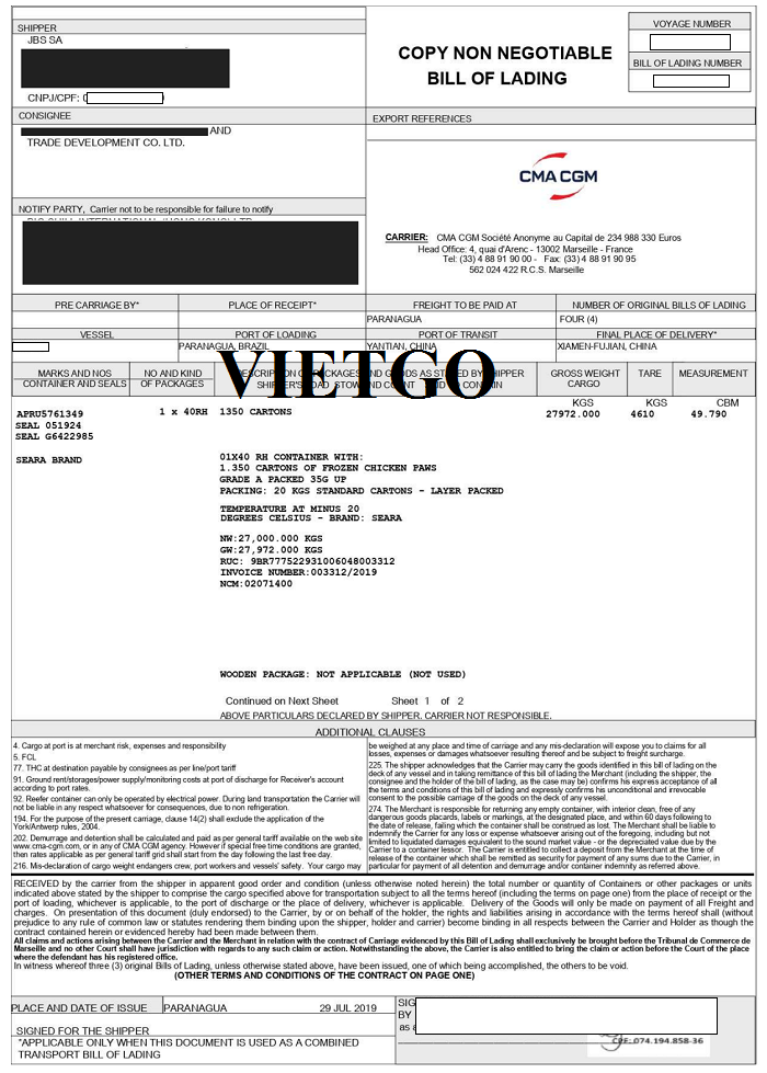 Dưới đây là hình ảnh bản vận đơn nhập khẩu chân gà từ Brazil vào Trung Quốc vào ngày 29/07/2019 mà công ty vị khách hàng đã nhập khẩu thành công: