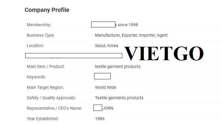 Ông Jorn là vị doanh nhân đến từ đất nước Hàn Quốc. Hiện ông đang làm chủ một doanh nghiệp mang tên ██████████ IMPEX LTD KOREA có trụ sở đặt tại ██████████-██████████ ██████████, thủ đô Seoul. Vị khách hàng là người có kinh nghiệm lâu năm trong lĩnh vực thương mại và xuất-nhập khẩu hàng hóa. Công ty của ông được thành lập từ năm 1986, đến nay đã có hơn 37 năm kinh nghiệm hoạt động trên thương trường. Ông Jorn cùng đội ngũ ban lãnh đạo đã nỗ lực không ngừng để đưa ██████████ IMPEX LTD KOREA phát triển bền vững như ngày hôm nay.