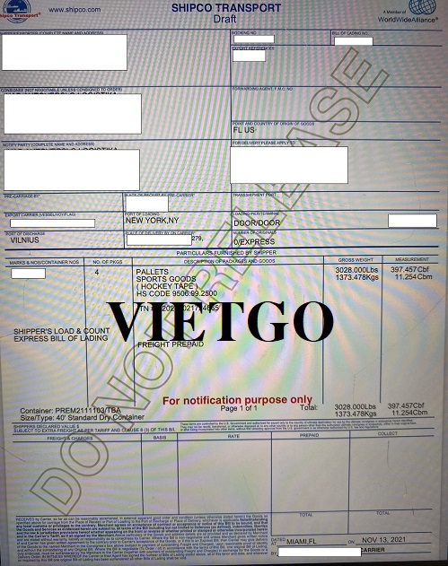 Hình ảnh vận đơn đường biển cho đơn hàng nhập khẩu băng dán thể thao do vị khách hàng thực hiện vào 03/11/2021