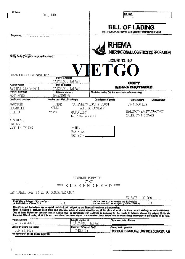 Dưới đây là bản vận đơn nhập khẩu nguyên vật liệu sản xuất lớp phủ từ Đài Loan vào ngày 28 tháng Một năm 2022 do công ty vị khách hàng từng thực hiện thành công: