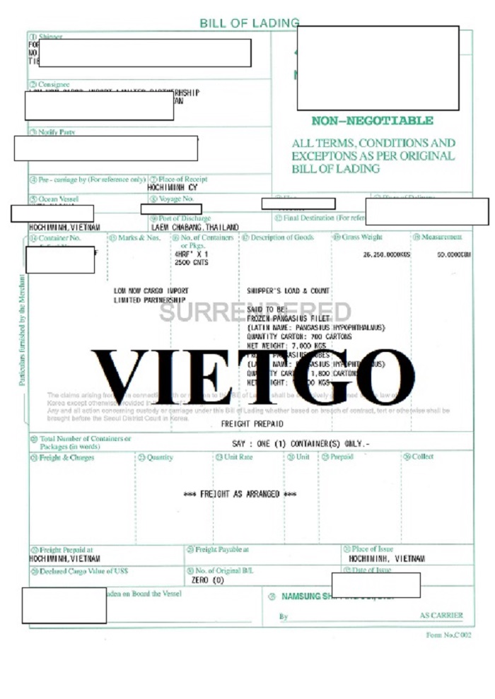 Dưới đây là hình ảnh một vận đơn đường biển (Bill of Lading) của một chuyến hàng nhập khẩu phi lê cá tra thành công từ Việt Nam đến Thái Lan vào ngày 24/03/2022 của công ty vị khách hàng: