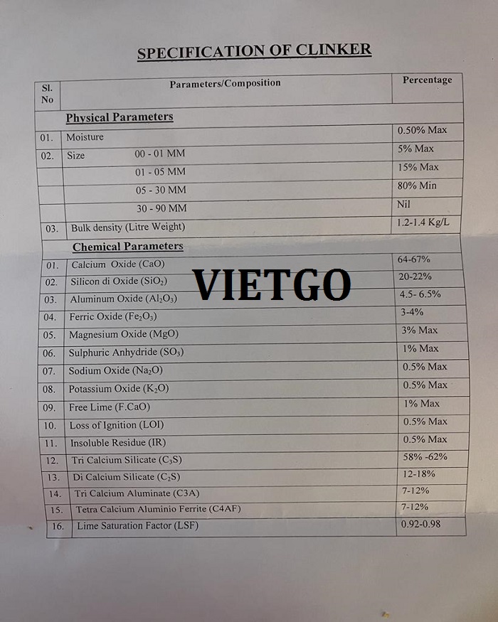 VIETGO xin gửi tới Quý nhà cung cấp thông tin về đơn hàng xuất khẩu clinker đến từ vị khách hàng tiềm năng, anh Kina.