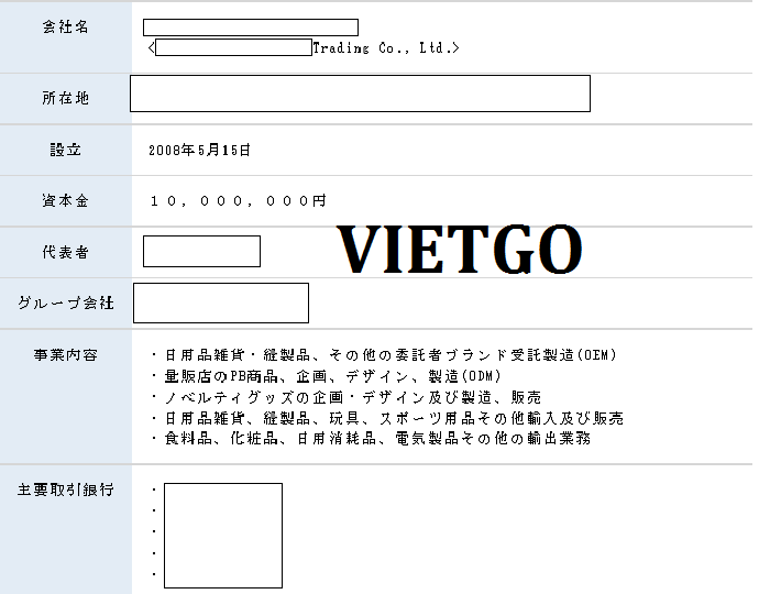 Được thành lập vào ngày 15 tháng 05 năm 2008, ██████████ Trading Co., Ltd. có địa chỉ tại ██████████████████████████████ ██████████, ██████████ ██████████, Osaka, Nhật Bản. Công ty hoạt động tích cực trong lĩnh vực sản xuất và kinh doanh thương mại bao gồm lập kế hoạch, thiết kế, sản xuất và kinh doanh các sản phẩm mới; nhập khẩu và bán nhu yếu phẩm hàng ngày, sản phẩm may vá, đồ chơi, dụng cụ thể thao và các mặt hàng khác; xuất khẩu thực phẩm, mỹ phẩm, hàng tiêu dùng hàng ngày, sản phẩm điện tử,…