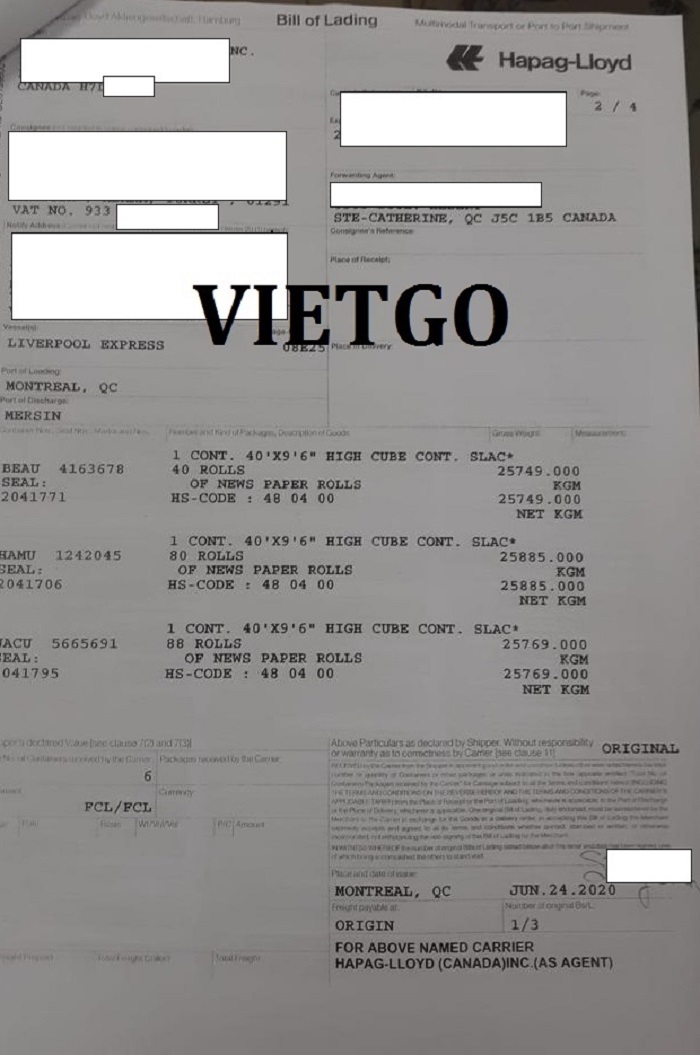 Dưới đây là vận đơn nhập khẩu sản phẩm giấy cuộn mà công ty vị khách hàng đã nhập khẩu thành công từ Canada vào tháng 06 năm 2020.