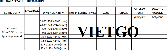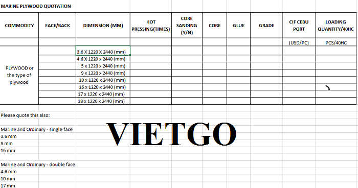 VIETGO xin gửi tới Quý nhà cung cấp thông tin về đơn hàng gỗ dán từ vị khách tiềm năng, cô Jean.