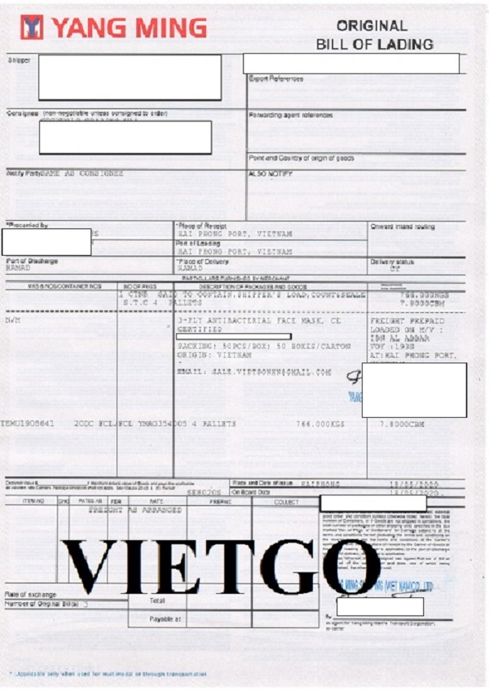 Vận đơn nhập khẩu sản phẩm khẩu trang của khách hàng từ Việt Nam